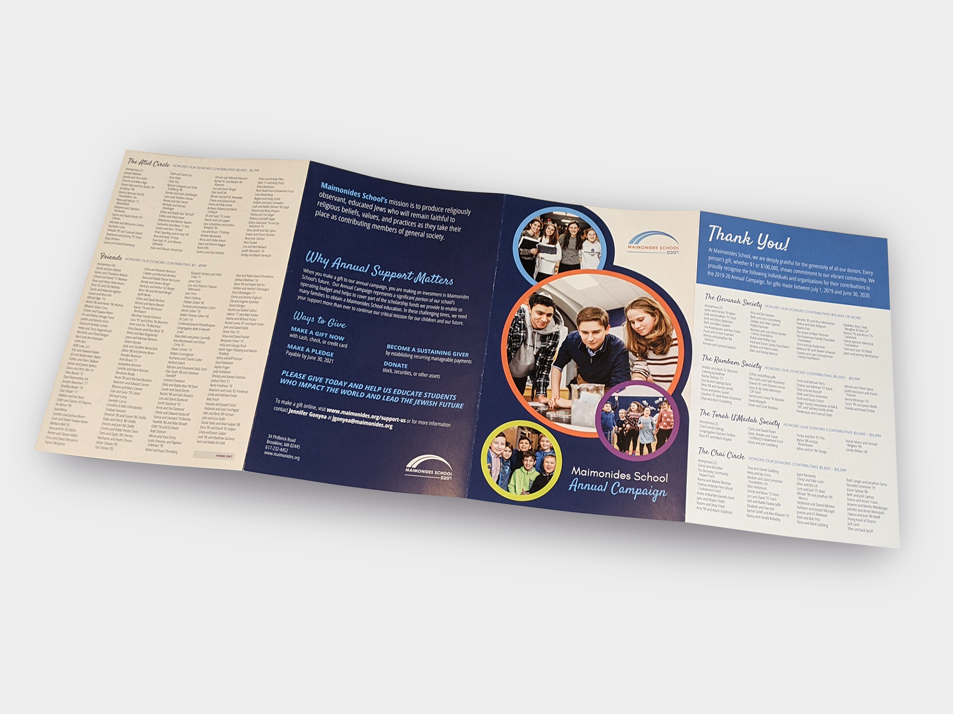 About the project: Design of the 2020 annual campaign fundraising mailing. Project included setting up the double gatefold layout to ensure all donors could accurately fit on six panels. Created a fresh innovative design that blends well with the school’s current branding efforts. The goal of this project was to put students and education at the forefront to potential donors.
